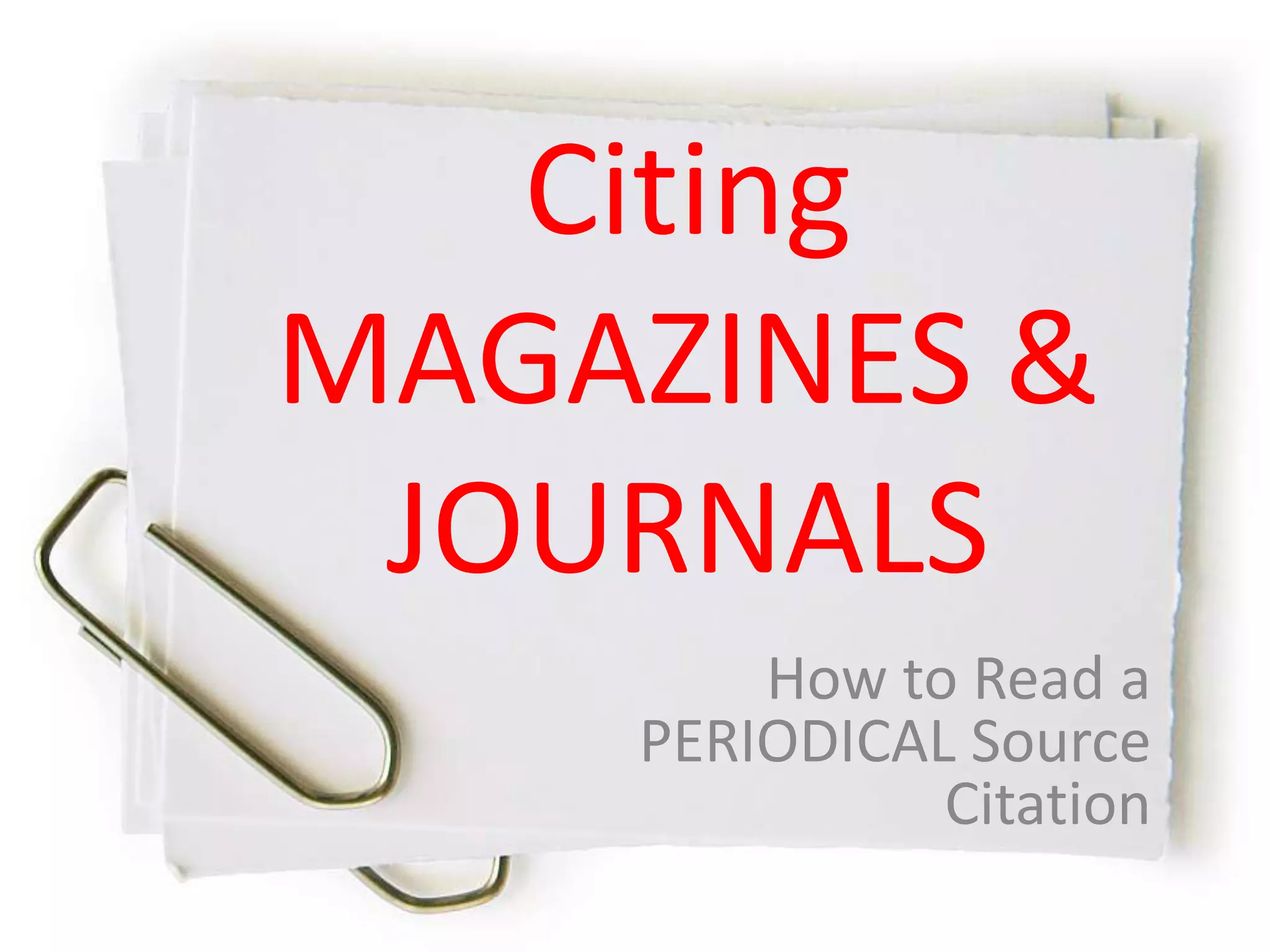 The document provides instructions for citing a magazine or journal article source. It explains that citations include author, article title in quotation marks, page numbers, name of magazine/journal in italics, volume and issue numbers, publication date, and retrieval information like a DOI, database name and accession number, or URL. All of these pieces of information need to be included and formatted correctly in order to fully cite the source.