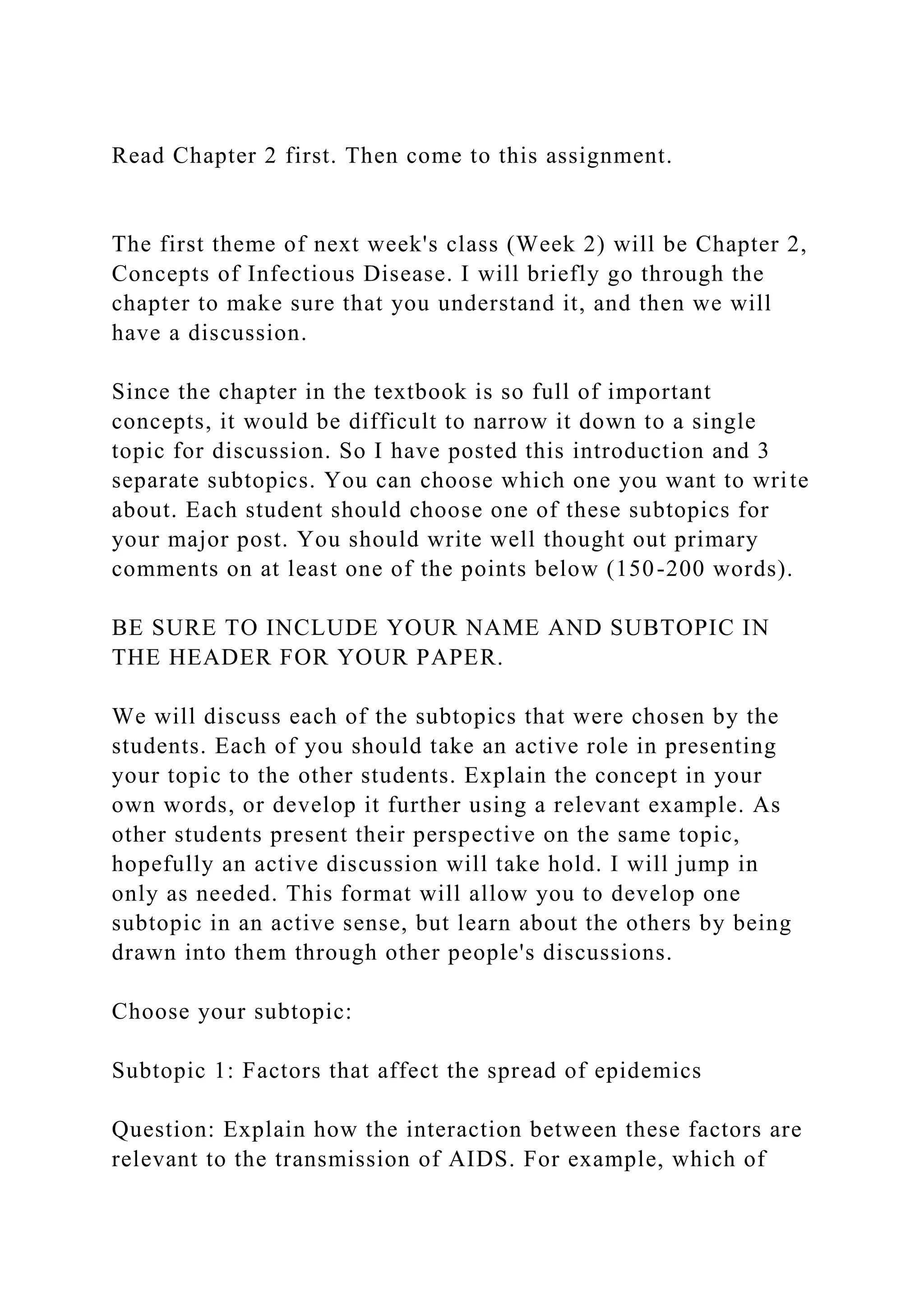 The document outlines an assignment based on Chapter 2, focusing on infectious disease concepts for the upcoming class discussion. Students are instructed to choose one of three subtopics related to the chapter, write a primary comment of 150-200 words, and actively participate in the discussion. The subtopics involve factors affecting epidemic spread, comparisons between acute and chronic infections, and the concept of herd immunity.