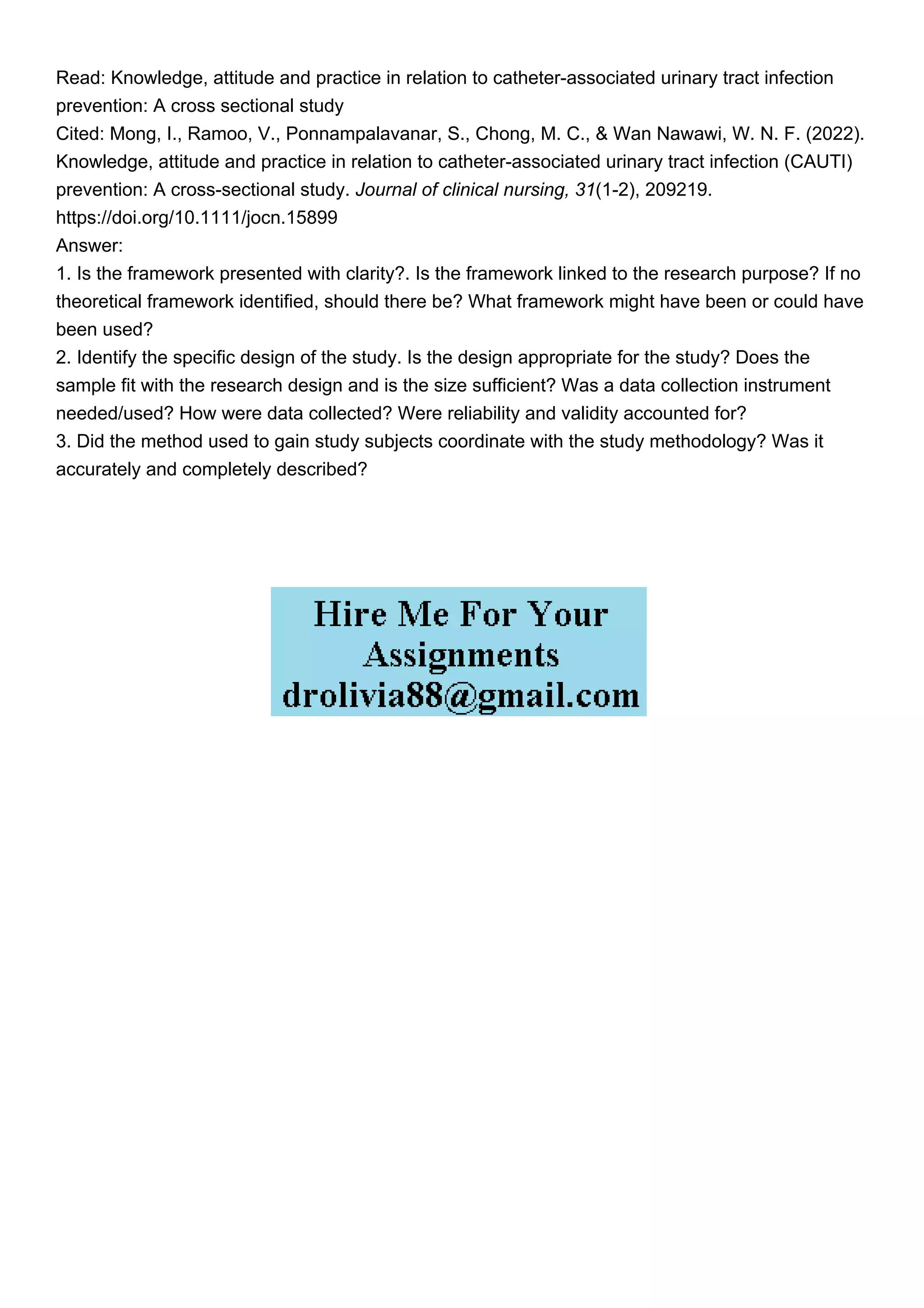 The document discusses a study on knowledge, attitudes, and practices regarding catheter-associated urinary tract infection (CAUTI) prevention. It raises questions about the clarity and linkage of the theoretical framework to the research purpose, the appropriateness of the study design, the adequacy of the sample size, and the methods of data collection. The document also evaluates whether the methods of participant recruitment were accurately described and aligned with the research methodology.