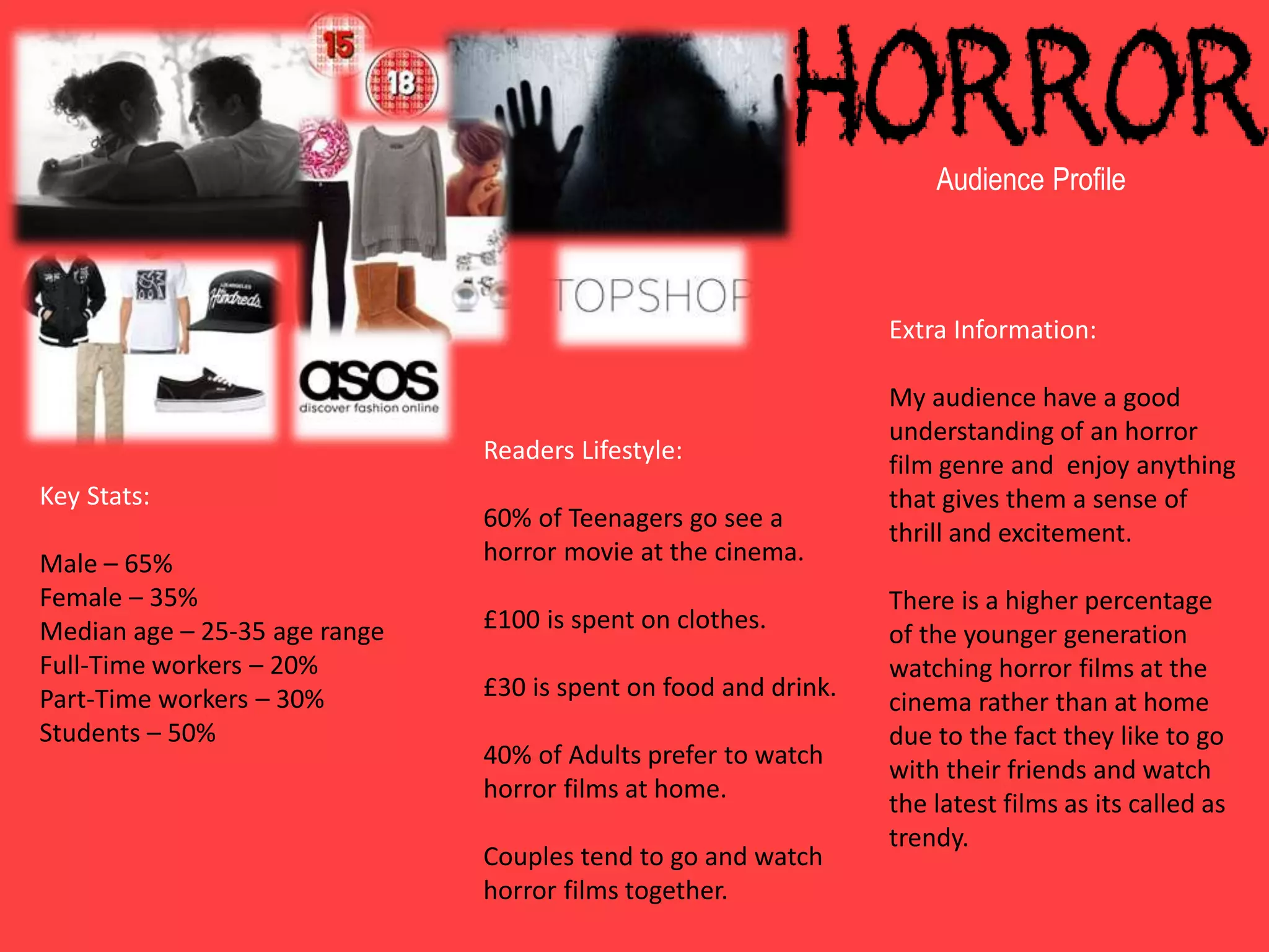 The target audience for horror films and content is primarily male, between 25-35 years old, with half being students. Sixty percent of teenagers watch horror movies at the cinema, while 40% of adults prefer watching them at home. Couples also enjoy horror films together. The younger generation likes watching new horror films at the cinema with friends as it is considered trendy, while the target audience enjoys thrill and excitement from the genre.