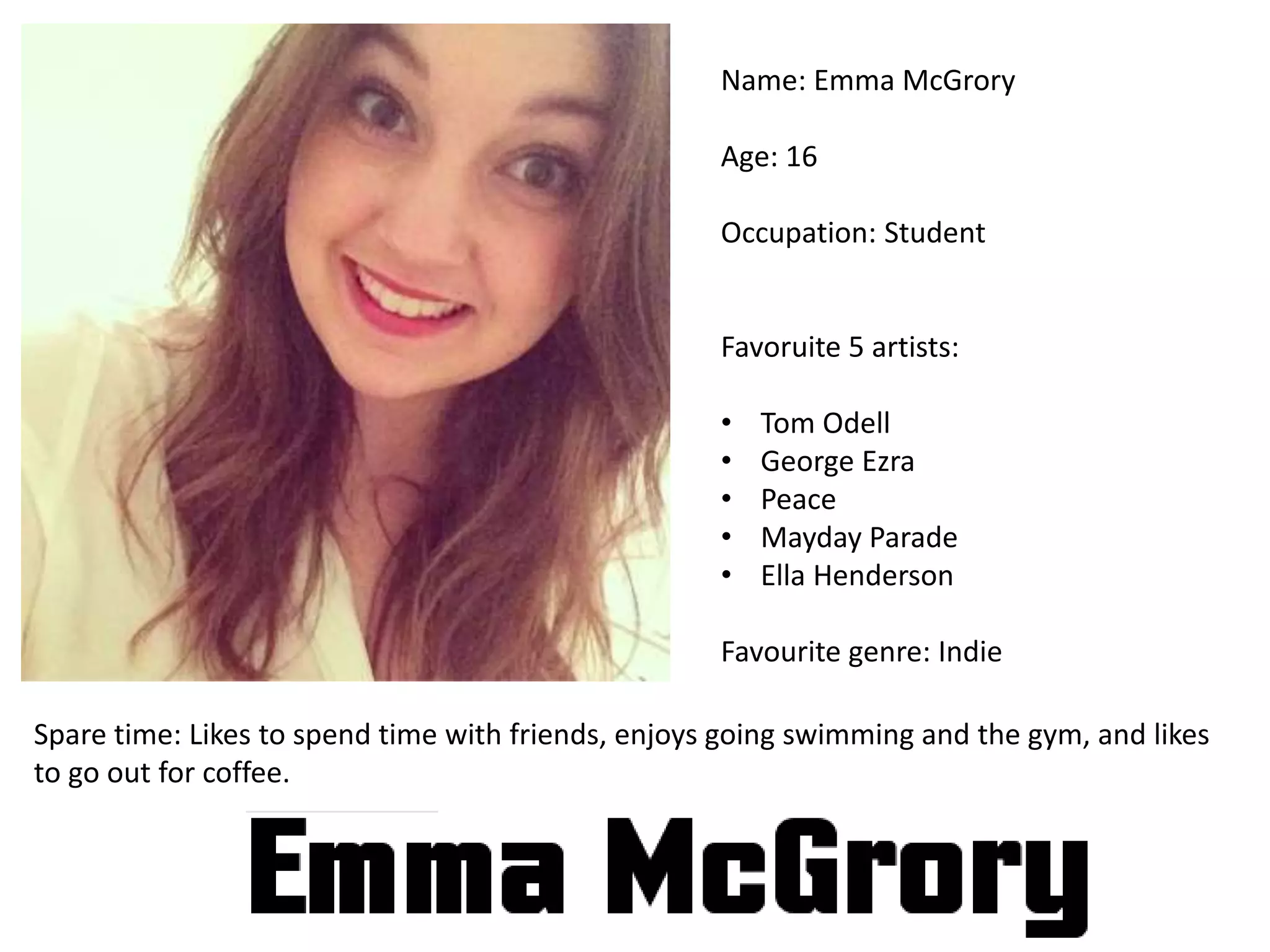 This document contains profiles for 5 students between the ages of 16-17. It lists their favorite artists, genres of music, and how they like to spend their spare time which includes activities like spending time with friends, going to concerts and festivals, working out, and going for walks.