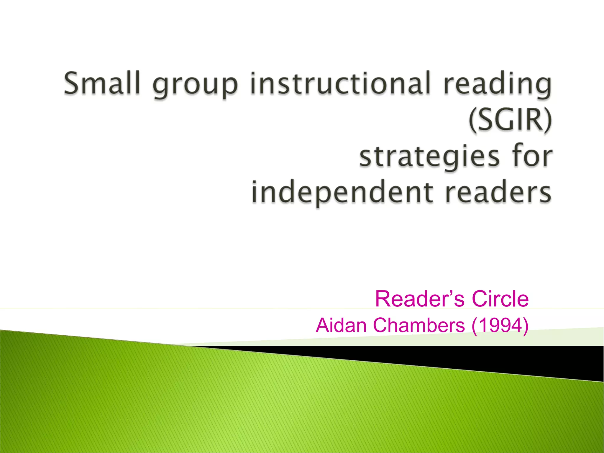 The Reader's Circle, as described by Aidan Chambers, is a collaborative reading strategy where students select a text, read it individually, and meet weekly to discuss their interpretations. The teacher facilitates discussions using basic questions to deepen understanding and encourages students to take notes and journal about their thoughts. This approach emphasizes independent reading, comprehension skills, and the exploration of diverse interpretations of texts, primarily focusing on fiction.
