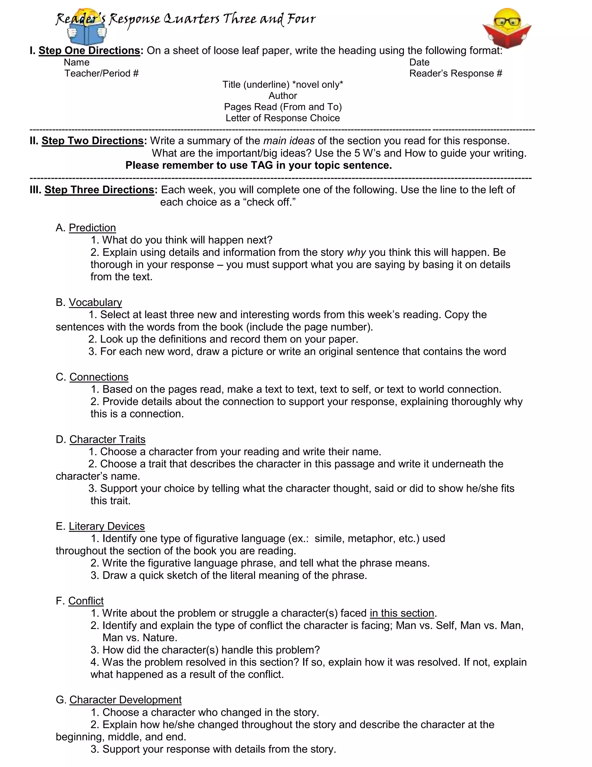 This document provides instructions for students to complete reader's response assignments for a novel in quarters three and four. It outlines seven steps for the assignment: 1) Include header information, 2) Write a summary of the main ideas in the assigned reading section, 3) Choose a response type from options A-G, 4) Complete the chosen response type which includes questions to answer about predictions, vocabulary, connections, character traits, literary devices, conflicts, or character development. The response is to be 1-3 sentences in length and provide the essential details about the reader's response assignment requirements.