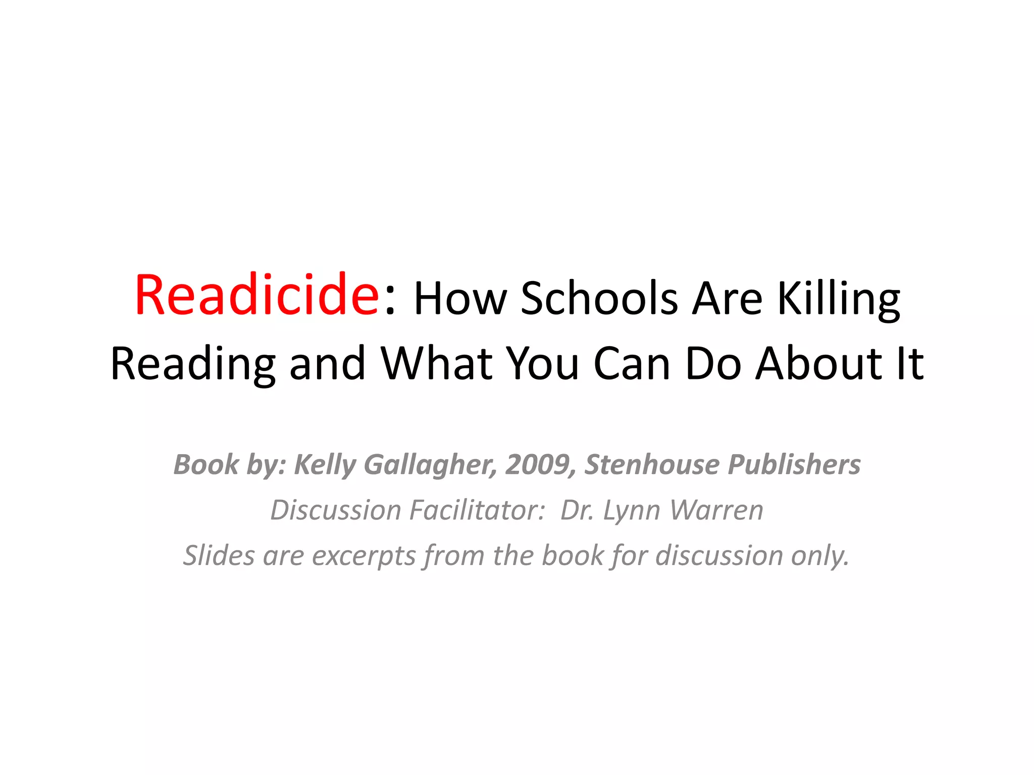 Kelly Gallagher's book 'Readicide' argues that school practices are systematically undermining the love of reading, particularly through excessive test preparation and fragmented teaching methods. The author highlights alarming statistics about literacy among adults and students, especially in low-income areas, while emphasizing the importance of recreational reading. Gallagher calls for a reevaluation of instructional practices to foster genuine reading engagement and prevent the decline of reading culture in schools.