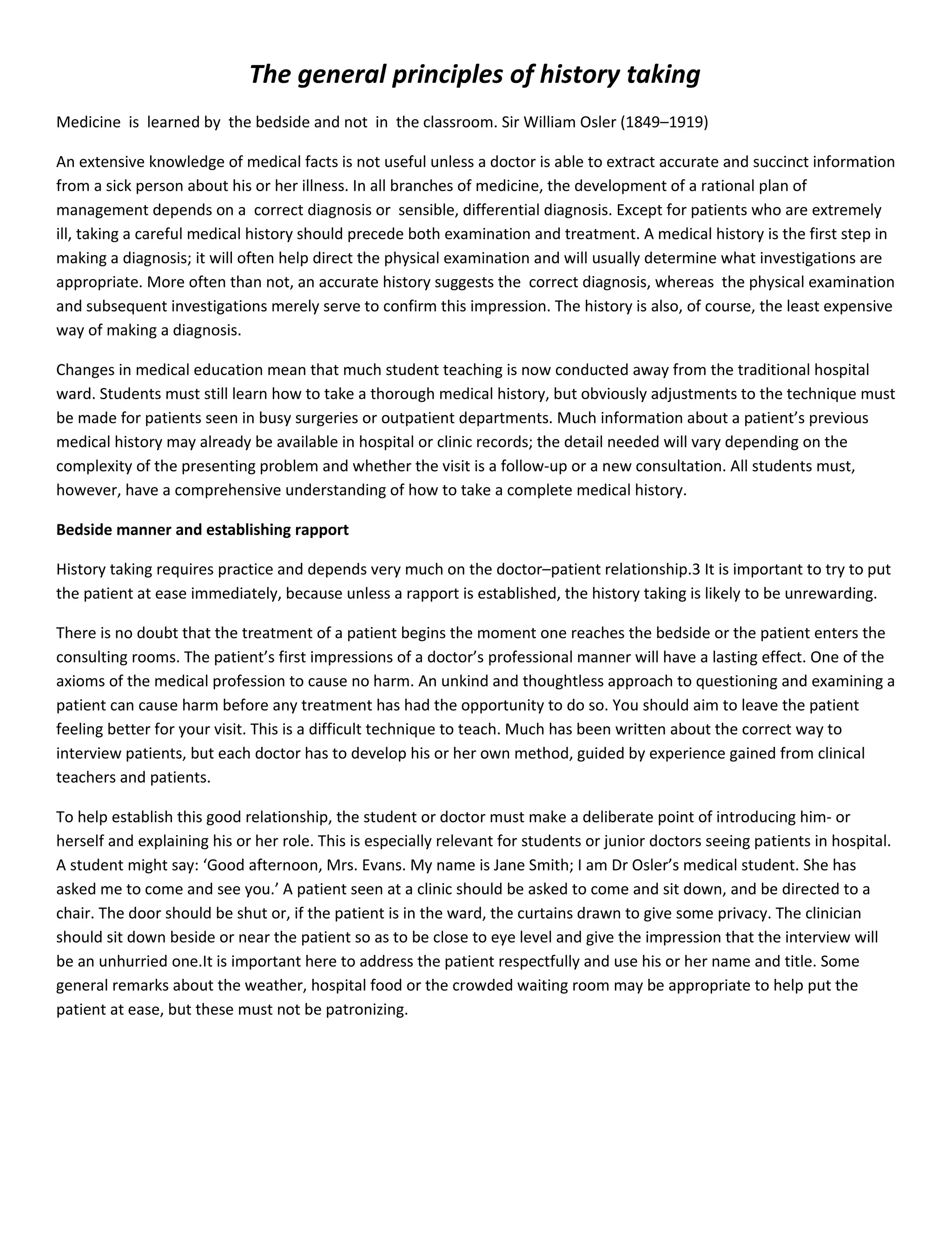 The document discusses the importance of taking a thorough medical history. It outlines that a history is the first step in diagnosis and is often the least expensive way to determine the correct diagnosis. It also emphasizes that history taking requires establishing rapport with the patient and developing one's own systematic technique through practice and experience. A table provides a suggested sequence for obtaining a patient's history.