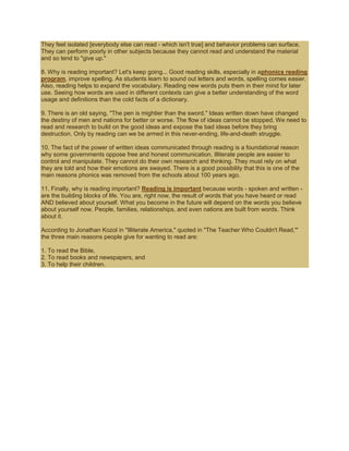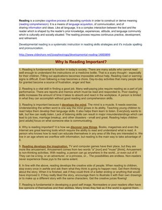 Reading is a complex cognitive process that allows for language acquisition, communication of ideas, and sharing of information. It requires continuous practice and development and is shaped by one's experiences and culture. Reading is important for functioning in society, gaining employment, developing thinking skills, learning new information, cultivating imagination and creativity, building self-esteem, and improving spelling and vocabulary. It is also fundamental to spreading ideas and critical for free thinking, as control of information is one reason some governments oppose literacy. Overall, reading is a vital skill that is the foundation for life.