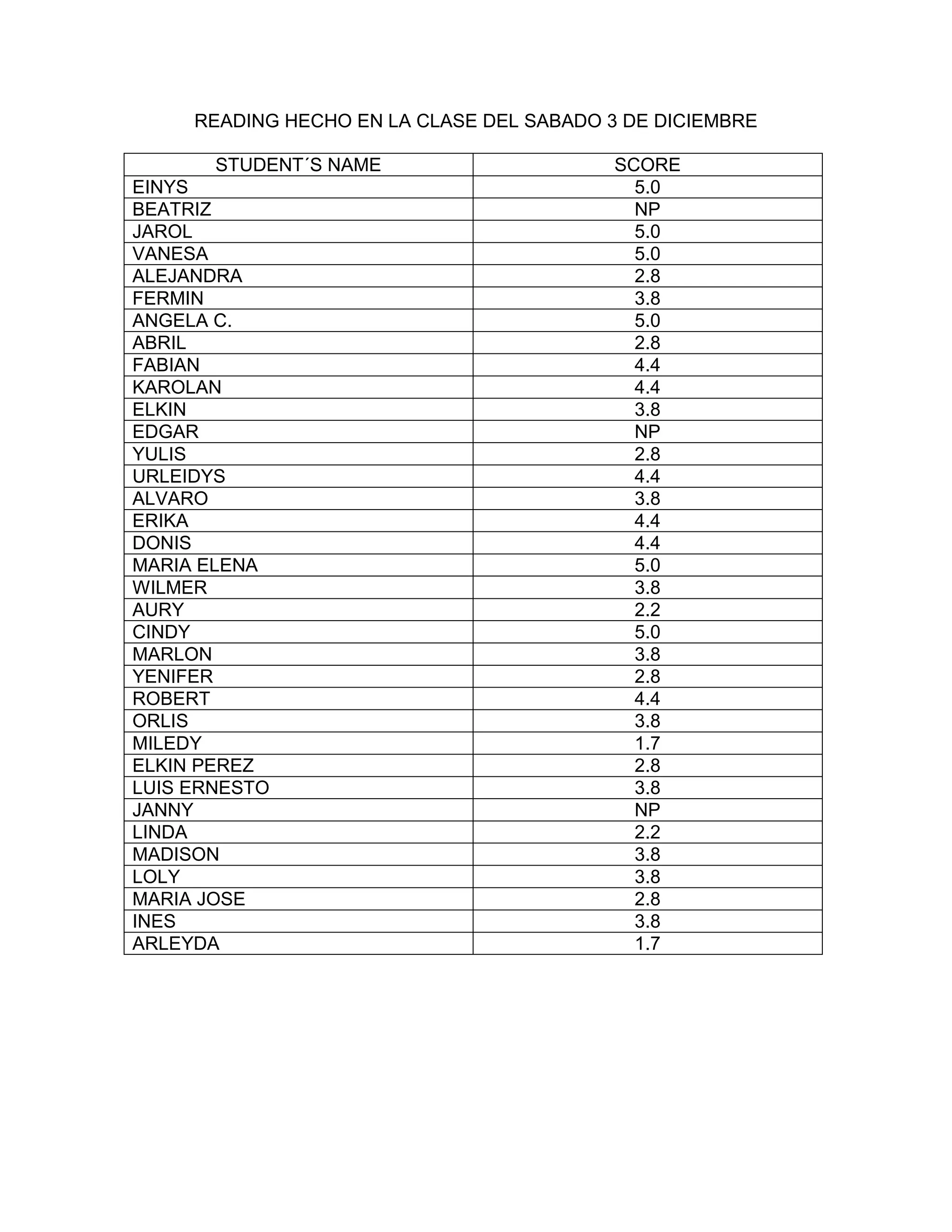 The document contains a list of students' names and their scores on a reading done in class on December 3rd. Some students received scores out of 5.0, while others received an "NP", likely meaning no points or no participation. Scores ranged from 5.0 as the highest down to 1.7 as the lowest recorded score.