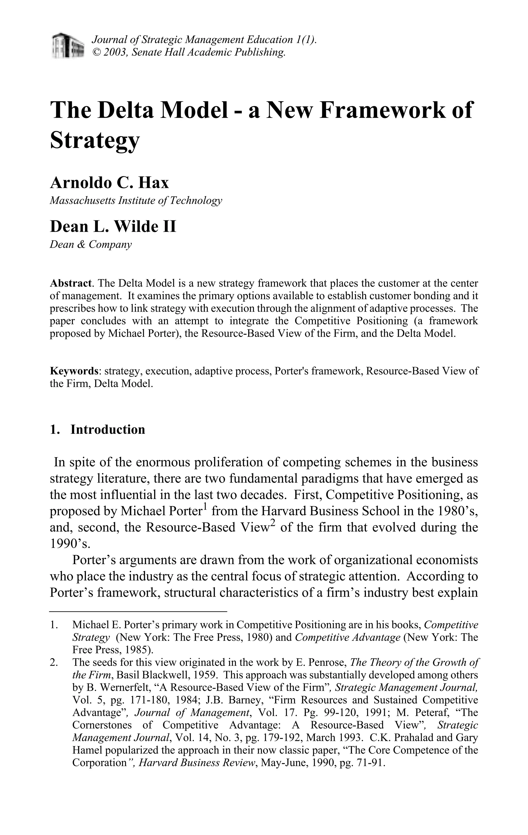 The document introduces the Delta Model, a new strategy framework that places the customer at the center of management. It examines three primary options to establish customer bonding: Best Product, Total Customer Solutions, and System Lock-In. Best Product focuses on product economics through differentiation or low cost. Total Customer Solutions provides customized solutions and seeks cooperation. System Lock-In aims for market dominance through network effects. The Delta Model complements Porter's framework and the Resource-Based View by adding the missing customer perspective to strategic thinking.