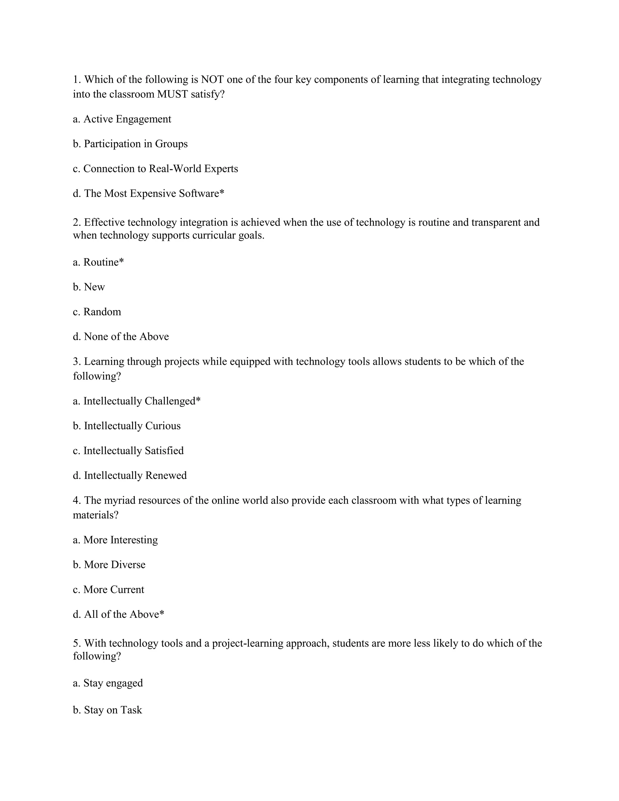 1. The key components of effective technology integration in the classroom are active engagement, participation in groups, connection to real-world experiences, but not the most expensive software.