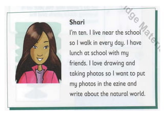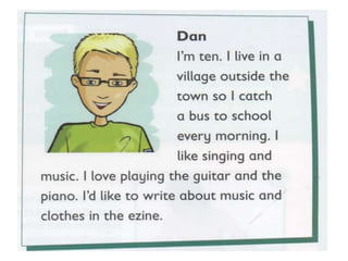 The document discusses a new online magazine called Kid's Box that is written by three students who attend City School. It provides brief details about each of the student writers, including that Alvin rides his bike to school and is the oldest, Dan is 10 years old, and one writer enjoys drawing and photography. The magazine also contains sections about music and fashion.
