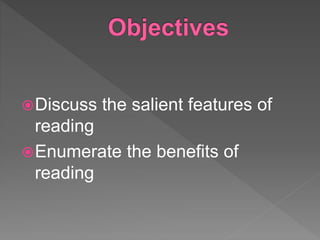 The document discusses reading as a process of receiving written symbols and deriving meaning from them. It is described as both a receptive skill, where we receive information, and a productive skill, as we are transmitting information to ourselves through pronunciation. Some key benefits of reading mentioned are mental stimulation which can prevent cognitive decline, stress reduction through immersion in stories, knowledge gain, vocabulary expansion, memory and analytical thinking improvement, better focus and concentration, improved writing skills, feelings of tranquility, and free entertainment.