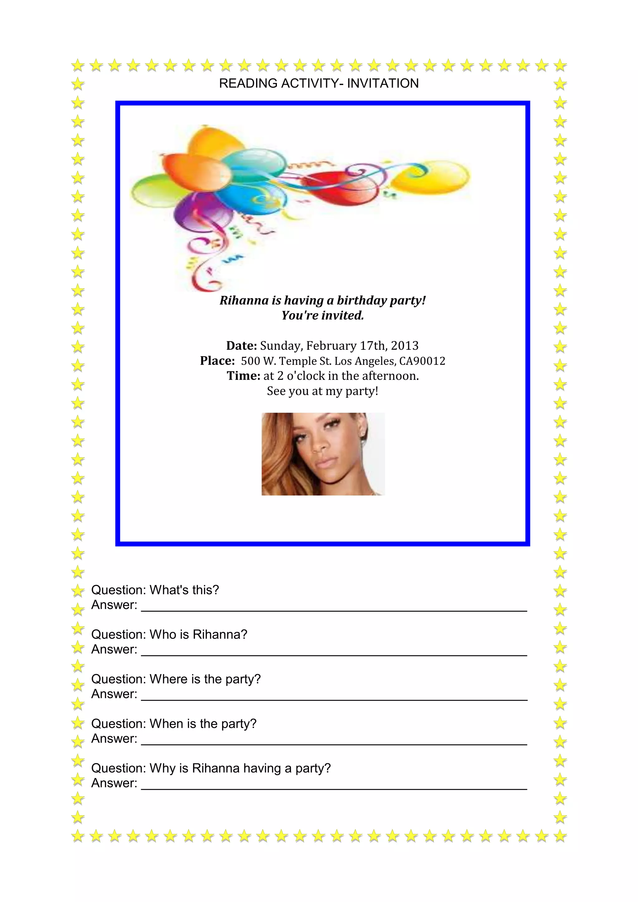 Rihanna is inviting someone to her birthday party that will take place on February 17th, 2013 at 2pm at 500 W. Temple St. in Los Angeles, CA. The invitation answers questions about who Rihanna is, where and when the party will be held, and that it is for her birthday celebration.