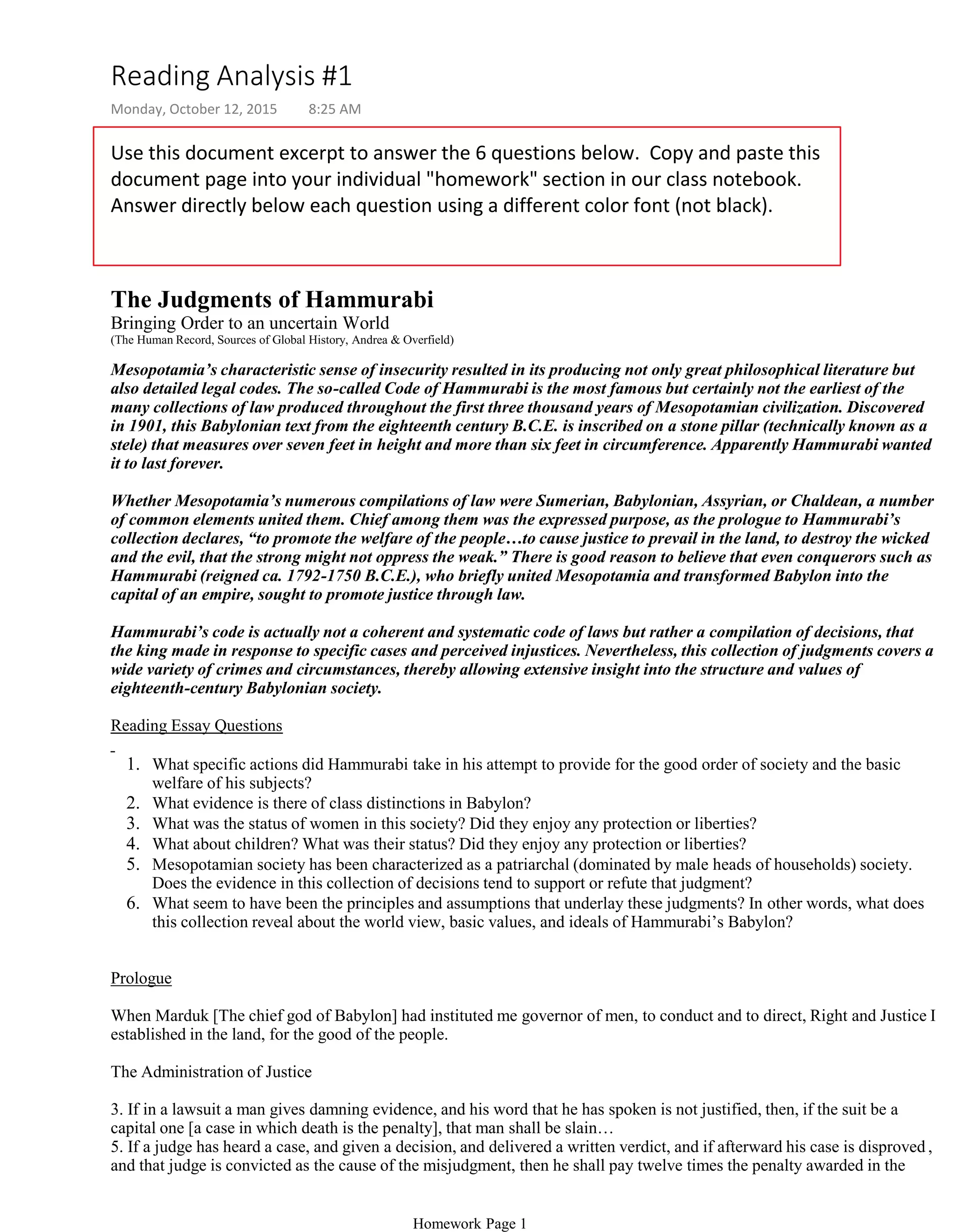 The Code of Hammurabi was one of the earliest legal codes from ancient Mesopotamia, discovered in 1901 and inscribed on a large stone pillar, seeking to promote justice and order through detailed laws covering a wide range of crimes and social circumstances. The code addresses property rights, family law, slavery, trade regulations, and physical injuries, revealing the patriarchal social structure and emphasis on compensation over punishment in Hammurabi's Babylon. Hammurabi introduces the code by stating his goal was to provide justice and welfare for the people and destroy the wicked, and concludes by hoping future rulers will uphold these laws to properly govern and delight their people.