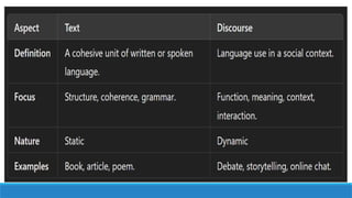 The document discusses the concepts of text and discourse, highlighting their definitions and differences. Texts are static, focusing on structure and content, while discourse is dynamic, emphasizing language use in social contexts. It stresses the importance of coherence, unity, and purpose in effective communication.