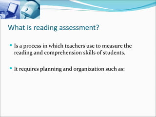 Reading assessment is a process used by teachers to measure students' reading comprehension skills. It requires planning activities to identify purposes and student needs. Teachers can use various assessment methods like retellings, checklists, logs, and tests to evaluate different reading skills at individual, group, and all age/grade levels. Assessments should be embedded in instructional activities and involve self and peer assessment. Teachers observe students and use portfolios to monitor progress over time. The goal is a well-rounded evaluation of decoding, comprehension, and student attitudes towards reading.
