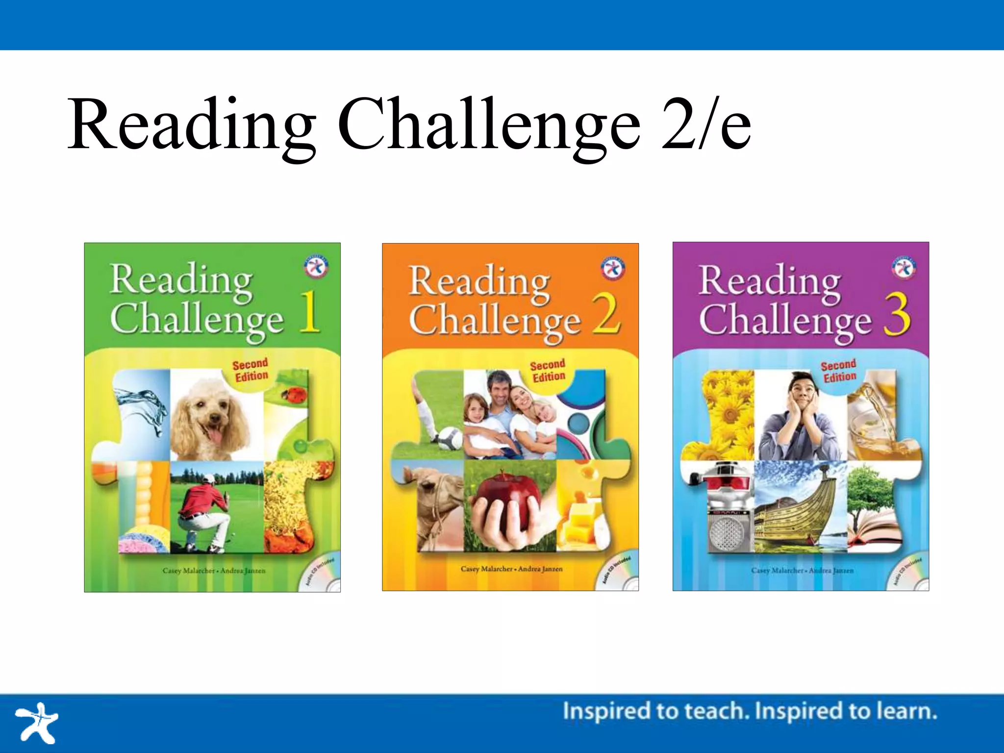 The document outlines the features of the Reading Challenge 2/e series, designed for low-proficiency readers to improve their reading skills and vocabulary. It includes exercises for vocabulary development, reading comprehension, and test-taking strategies, with varied reading passages and integrated skills for enhanced comprehension. Additional elements focus on grammar, writing opinions, and speaking skills to foster overall language acquisition.