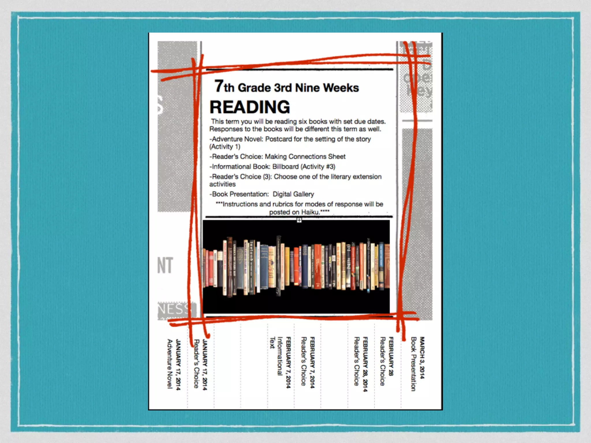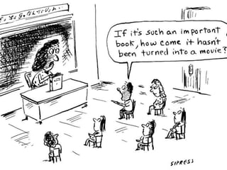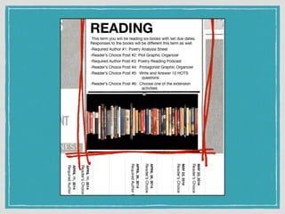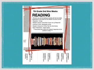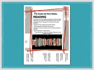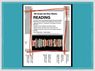 The document presents a reading challenge aimed at middle school students, emphasizing the importance of continued reading skill development. It highlights statistics on student reading habits and incorporates examples of student work and projects. The initiative aims to enhance literacy through technology, encouraging students to create a collaborative online resource for sharing their reading experiences.