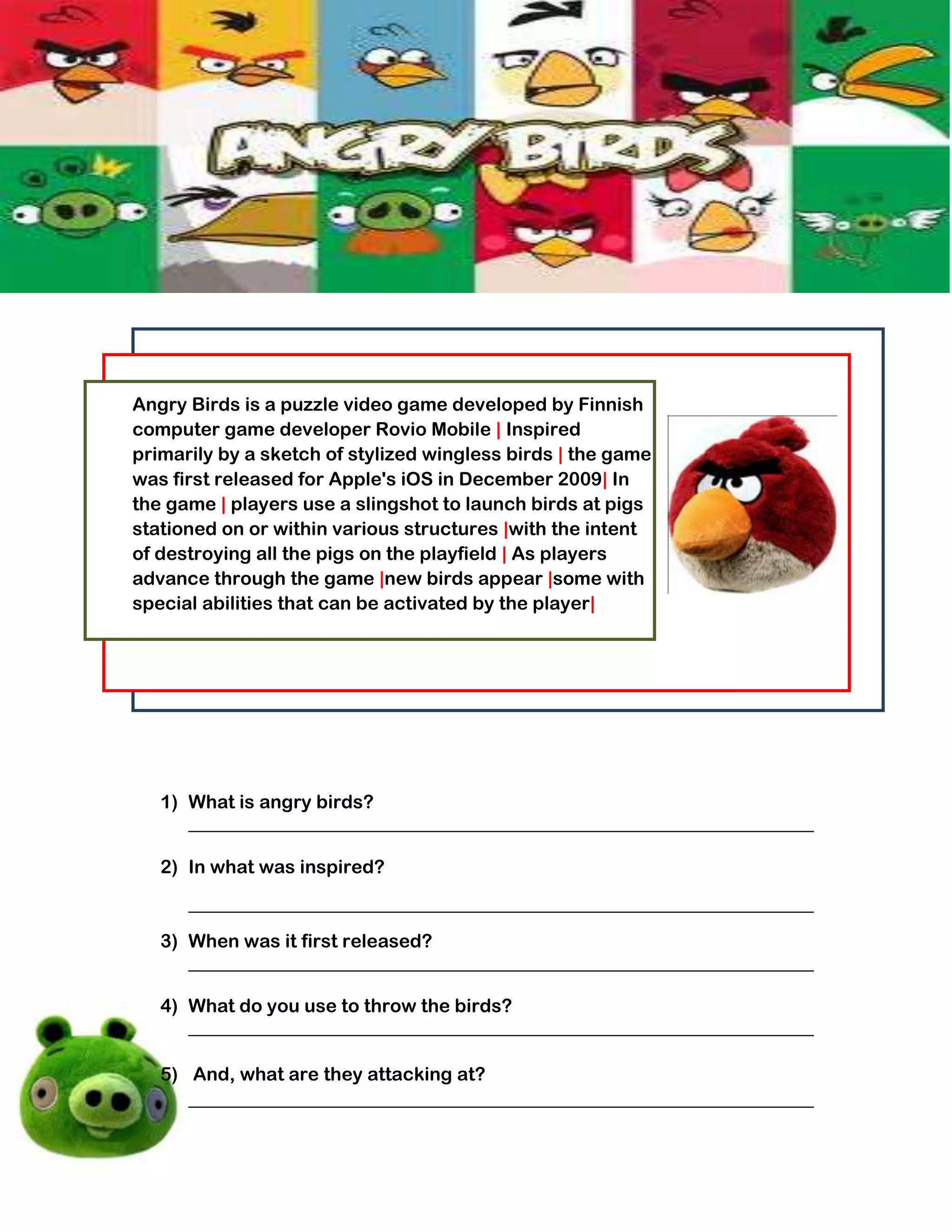 Angry Birds is a puzzle video game developed by Rovio Mobile where players use a slingshot to launch stylized wingless birds at pigs stationed in or around structures, with the goal of destroying all pigs. Inspired by a sketch of stylized wingless birds, the game was first released for Apple's iOS in December 2009 and introduces new bird types with special abilities as players progress.