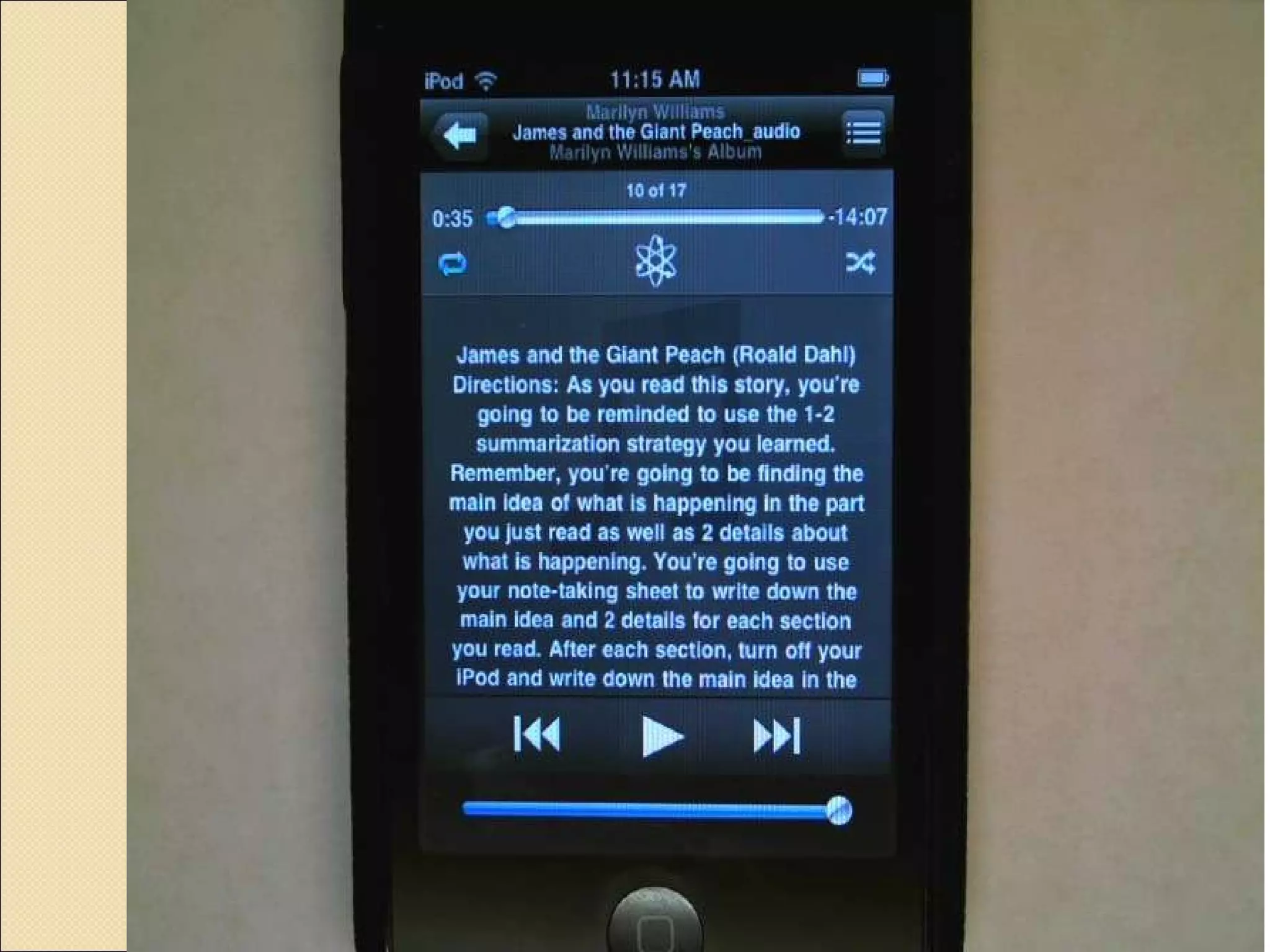 The document describes a study that used iPod Touches to help middle school students improve their reading comprehension skills. Teachers provided students with iPods loaded with short stories and audio recordings of comprehension strategies. Students listened to the stories and strategies independently on the iPods. The study found that students who used the iPods with embedded comprehension instruction scored better on reading assessments compared to students who did not use the iPods. Students also reported that they found the iPods and embedded note-taking strategies helpful for remembering the stories. The document discusses recommendations for using this iPod-based approach to provide targeted reading intervention.