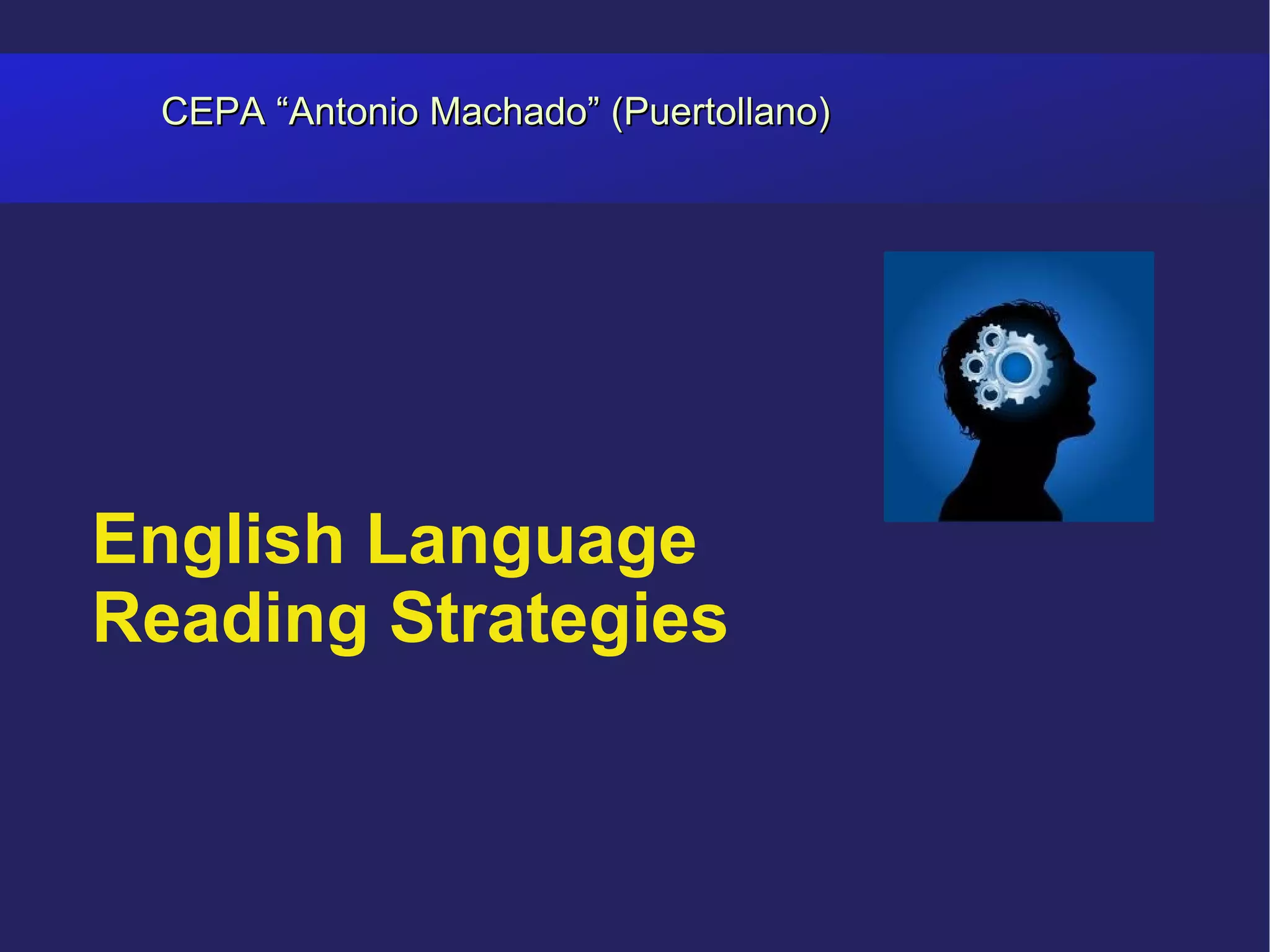 CEPA “Antonio Machado” is a school located in Puertollano, Spain. The document provides tips and strategies for reading comprehension in English, including: predicting content before reading; identifying unfamiliar words; skimming and scanning for main ideas; identifying key words, sentences, and phrases; distinguishing facts from opinions; and answering questions after reading. The tips are divided into sections for before, during, and after reading.