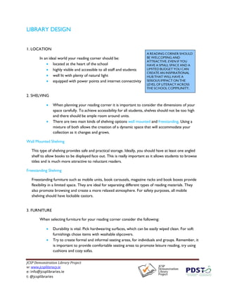 This document provides guidelines for setting up a school library or reading corner, including recommendations for location, shelving, furniture, equipment, signage, managing the library collection, and cataloguing systems. The ideal location is at the heart of the school, is highly visible and accessible, and is well-lit with power and internet. Shelving options include wall-mounted and freestanding units of various types. Furniture should be durable and allow for both formal and informal seating. Collections should be tailored to student interests and abilities. Small libraries can use simple tracking systems while larger ones may implement software-based cataloguing of fiction and non-fiction sections.