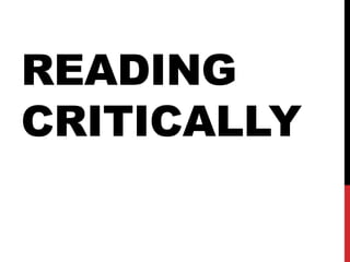 The document provides guidance on how to critically read essays, including establishing context about the author and intended audience, identifying the organizational strategy used such as narration or comparison, and how to annotate including marking memorable statements, questions, and analyzing the writer's topic, thesis, and effectiveness. Readers are advised to read selections at least twice, noting different things during initial and second readings such as key terms and questions.