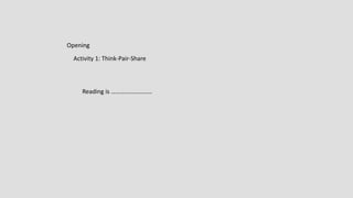 The document outlines the stages of reading development, from pre-reading to advanced reading, detailing characteristics and outcomes for learners. It emphasizes the progression through various levels such as emergent, early, transitional, self-extending, and advanced readers, highlighting activities and comprehension strategies at each stage. Additionally, it references national curricula to support the learning outcomes associated with these stages.