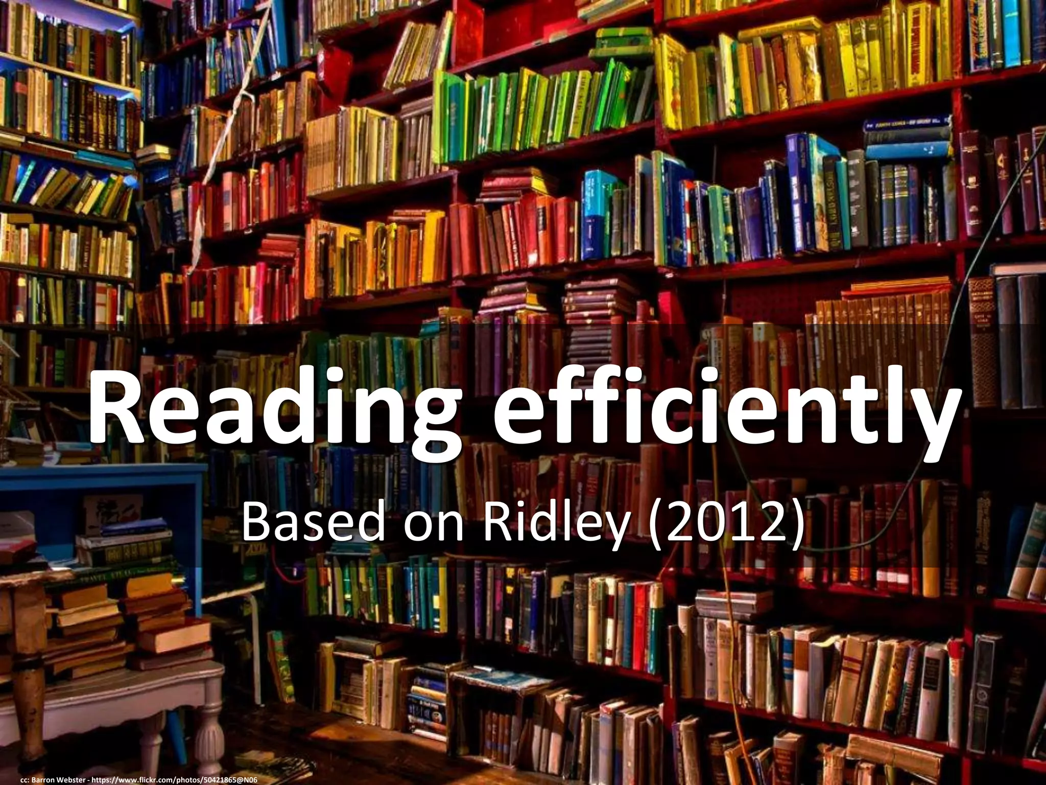 The document provides tips for reading efficiently, including avoiding saying words aloud in your head, focusing on phrases rather than individual words, running your finger along the page margin to focus eye movement, minimizing backtracking by keeping your eyes moving forward, using context clues rather than a dictionary when possible, varying reading speed based on content complexity, and checking comprehension and accuracy after practicing under timed conditions. The tips are based on strategies from Ridley's 2012 book on conducting literature reviews.