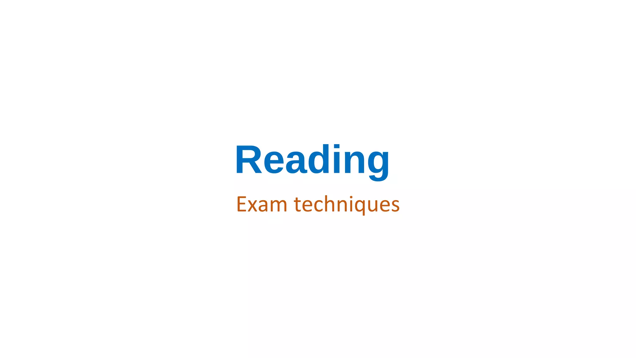This document provides guidance on techniques for the Reading section of the IELTS exam. It summarizes the structure and content of the different parts of the Reading section, including multiple choice questions, matching headings, sentence completion, and paragraph ordering. It also provides tips for each question type, such as skimming the text before answering questions and using linguistic clues to help match sentences to gaps. The document emphasizes reading questions carefully, making notes, eliminating incorrect answer options, and guessing rather than leaving questions unanswered.