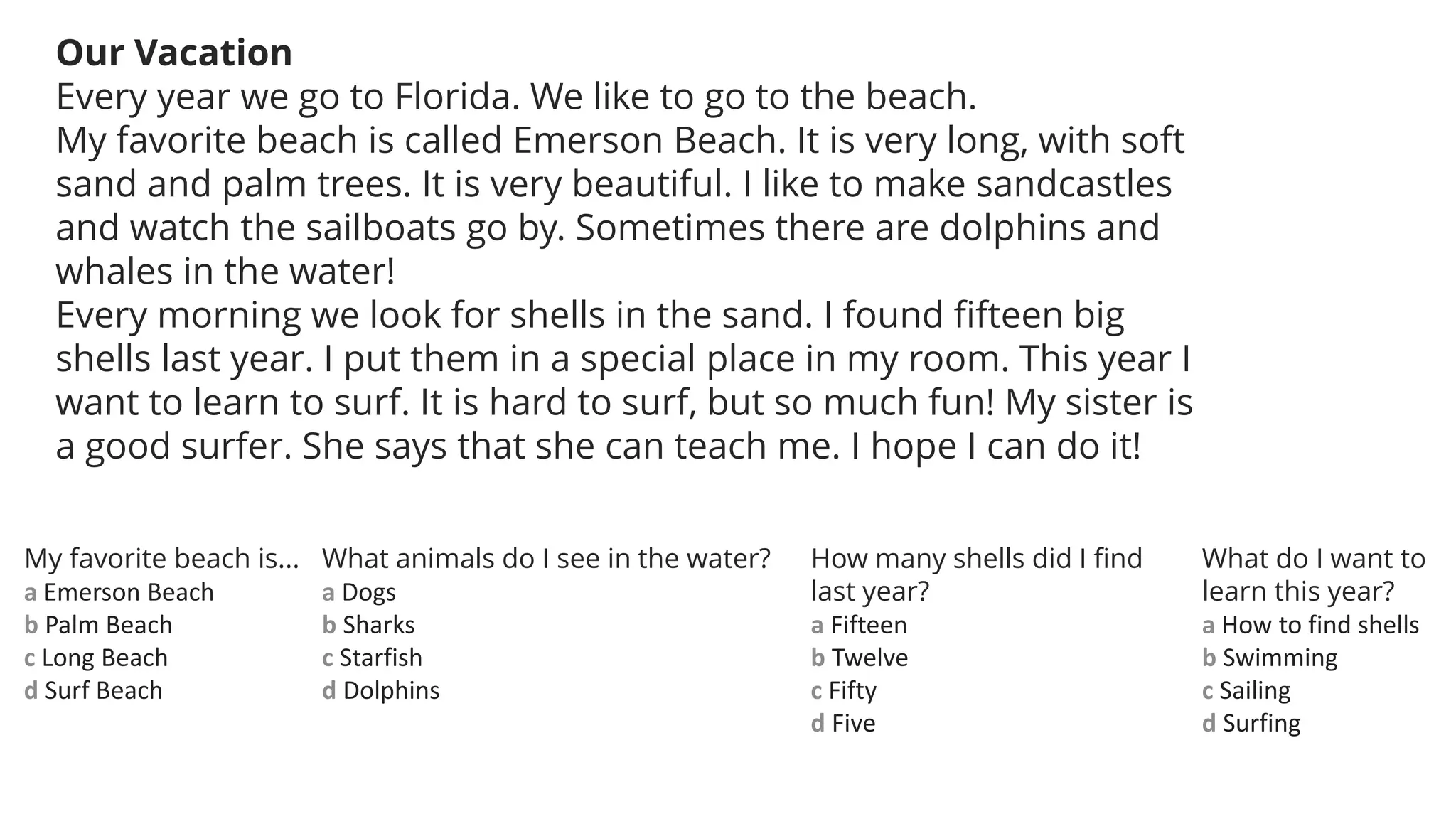 Every year the family goes to Florida for vacation. The narrator's favorite beach is Emerson Beach, which has long stretches of soft sand and palm trees and is very beautiful. At Emerson Beach, the narrator likes to make sandcastles and watch sailboats while occasionally spotting dolphins and whales in the water. Each morning, the family looks for shells in the sand. Last year, the narrator found fifteen big shells. This year, the narrator wants to learn how to surf, though it is difficult, but looks like fun. The narrator's sister is a good surfer and offers to teach surfing skills.