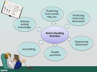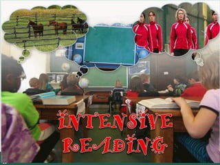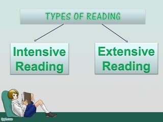 This document provides an overview of teaching reading. It defines reading as receiving and interpreting information from print. Key aspects discussed include the importance of teaching reading for different purposes. It also outlines lower level reading processes and comprehensive teaching approaches, including before, during, and after reading activities. The benefits of extensive reading are explained, such as reading for pleasure. Balancing intensive, extensive, vocabulary, and skills development is emphasized for an effective reading program.
