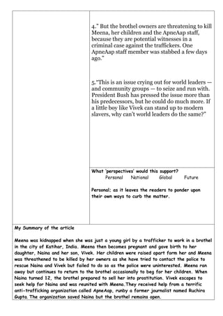 Meena was kidnapped as a young girl and forced to work in a brothel in India, where she had two children who were raised apart from her. When her daughter turned 12, the brothel planned to sell her into prostitution. Meena's son Vivek sought help from an anti-trafficking organization, who rescued the daughter but the brothel remained open, threatening retaliation against witnesses. The article outlines the ongoing problem of sex trafficking in India.