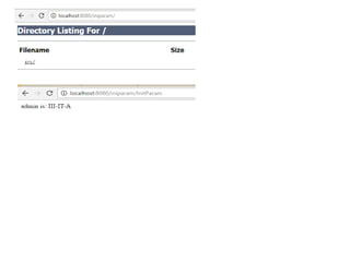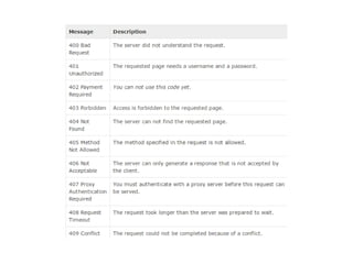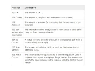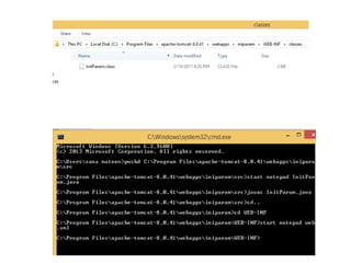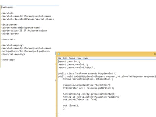 The document discusses how servlet initialization parameters allow values to be passed to servlets without needing to recompile when the values change. Initialization parameters are defined in the web.xml file and can be accessed in servlets through the ServletConfig interface. This avoids having to edit servlet files when information is modified, as changes only need to be made in the deployment descriptor. The document also provides an overview of HTTP status codes and common methods for setting status codes in servlet responses.