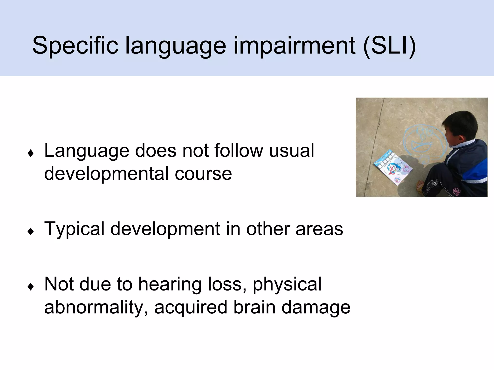 1) SLI causes language development to deviate from the typical course even though other areas develop normally, and is not due to hearing loss, physical issues, or brain damage.