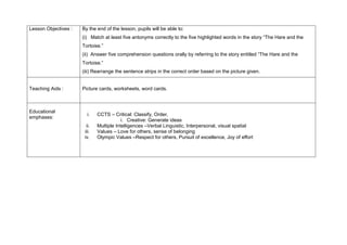 This lesson plan is for a 3rd grade English class about the story "The Hare and the Tortoise". The plan outlines pre-reading, during reading and post-reading activities. Pre-reading activities include watching a video clip and matching animal characteristics. During reading, students will read the story in groups and answer comprehension questions. Post-reading, students will make mini books retelling the story and discussing the moral values learned. The goal is for students to understand and discuss the fable.