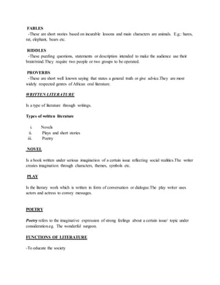 The document provides an overview of literature, defining it as an artistic expression of human ideas and social realities through language. It discusses various types of literature, including oral and written forms, and elaborates on literary elements such as plot, characters, and themes, with a specific focus on the novel 'Unanswered Cries' by Osman Conteh, which addresses the issue of female genital mutilation. Key themes explored include cultural practices, love, responsibility, and conflicts among characters, along with the use of literary devices like metaphors and personification.