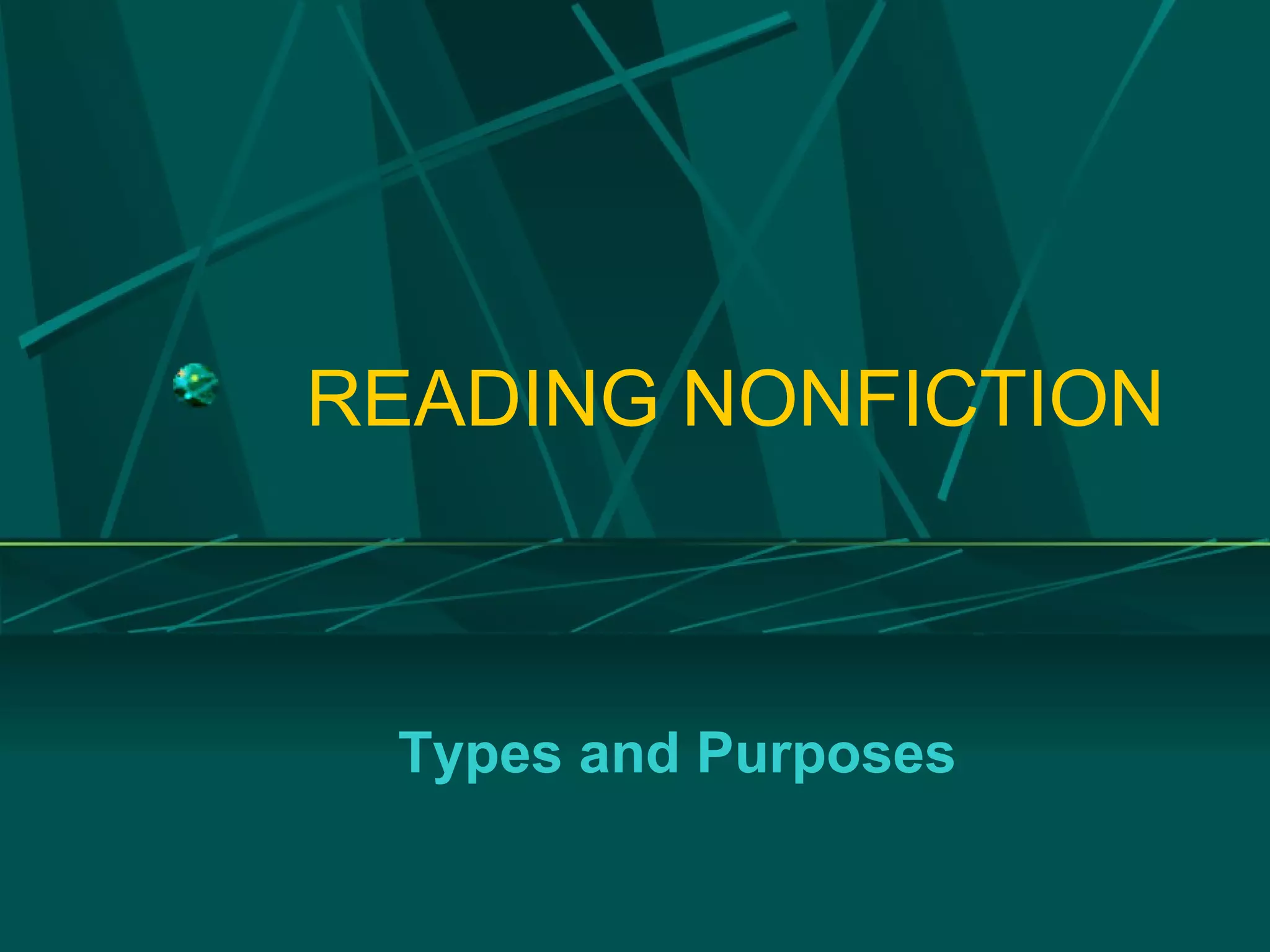 The document discusses the various types and purposes of nonfiction writing. It covers genres such as journalism, essays, personal narratives like diaries and memoirs, as well as biographies and autobiographies. Some key points are that nonfiction writing is about real people, places and events, and can include facts as well as opinions. Readers should be critical and consider the writer's background, purpose, attitude and intended audience. The different genres and types of nonfiction each have their own characteristics and purposes.