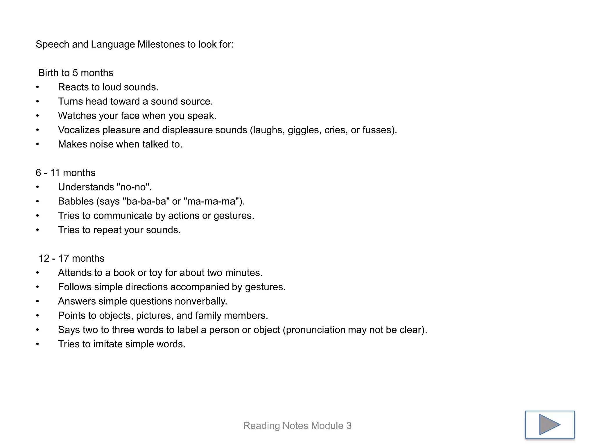 The document outlines speech and language milestones from birth to 5 years. It describes skills that should be present at various age ranges, including reacting to sounds as an infant, babbling as a toddler, using simple words and phrases, and engaging in conversation by age 5. The document also lists potential signs and effects of common speech/language disorders like problems with comprehension, expression, articulation, fluency, or hearing. Finally, it provides tips for assessing a child's phonology, semantics, pragmatics, and other language skills in the classroom.