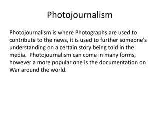 This document summarizes and analyzes several photographs taken by photojournalists Tim Hetherington and Steve McCurry. It discusses Hetherington's photographs documenting war and natural disasters in Libya, Afghanistan, and Indonesia. It describes his use of wide angles to show the scope of damage. It also analyzes McCurry's iconic photograph of the "Afghan Girl" taken in a refugee camp, noting how the green background makes her eyes stand out. The document examines elements like composition, lighting, focus, and storytelling intent across the various images.