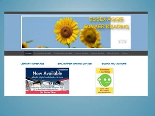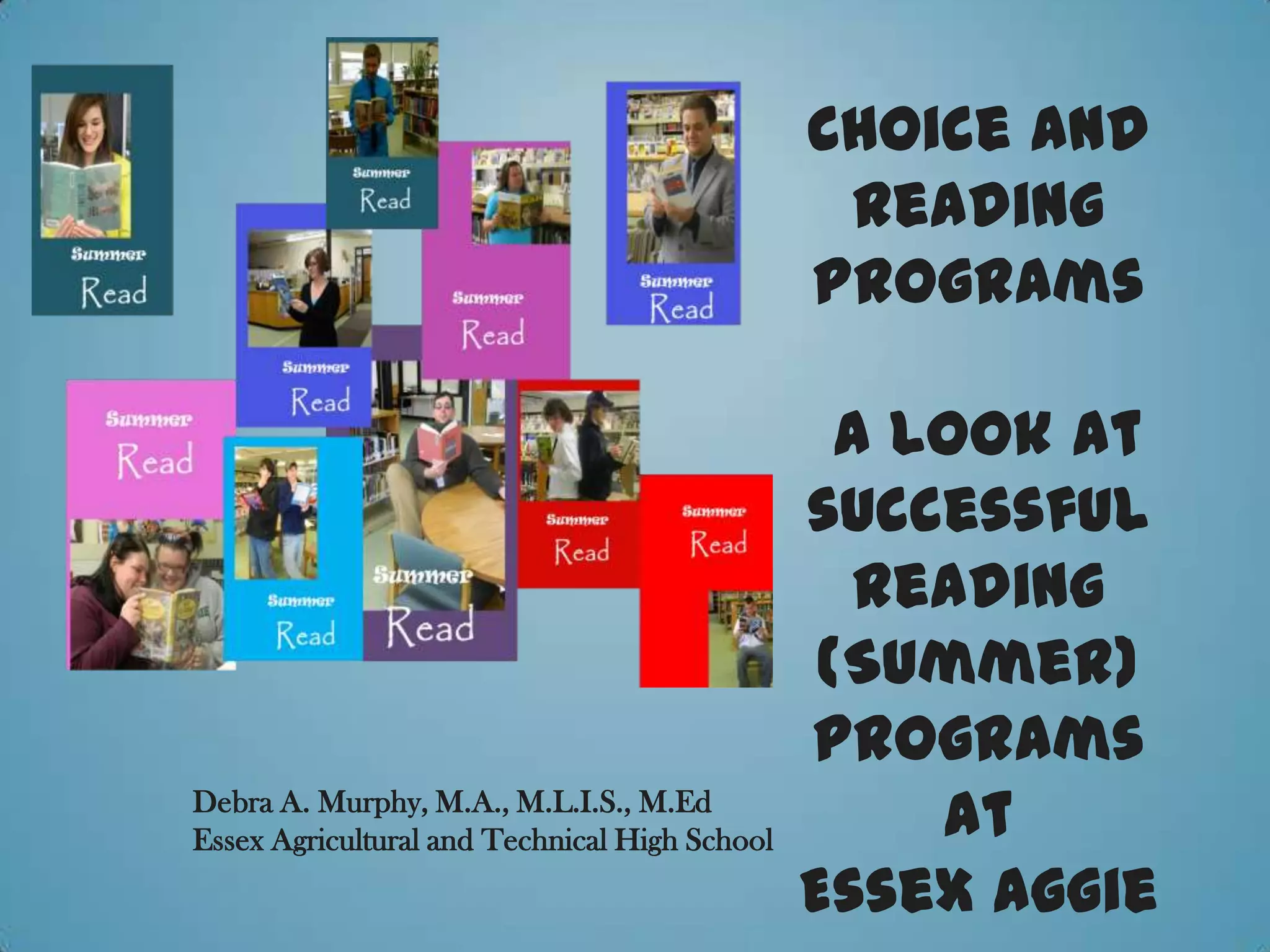 This document discusses the successful summer and school year reading programs at Essex Aggie. It highlights that choice and reading begins in September, not just the summer. Promotion and marketing of reading has been key to success. The program includes independent reading across all grades and classes, not just English. Technology like e-readers are also utilized. Assessment data shows rising circulation statistics over time, indicating the programs are achieving results.