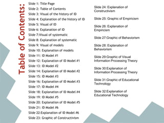 This document provides an overview of different instructional design models through a series of slides. It begins with providing context on the history of instructional design. It then defines key concepts like instructional design, systematic approaches, and models. The bulk of the document describes six different instructional design models through graphics and explanations of each model's steps or phases. It concludes by defining and providing graphics for concepts related to learning theories - constructivism, empiricism, behaviorism, information processing theory, and educational technology.