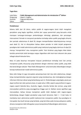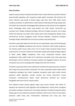 Dokumen tersebut membahas pergeseran paradigma administrasi publik tradisional ke arah manajemen publik. Administrasi publik tradisional dinilai kurang mampu menyesuaikan diri dengan perkembangan zaman sehingga mulai digantikan oleh konsep manajemen publik yang lebih mengedepankan kinerja dan akuntabilitas. Walaupun terdapat kritik, model manajemen publik kini telah diterapkan secara luas dengan arah pengembangan lebih mengur