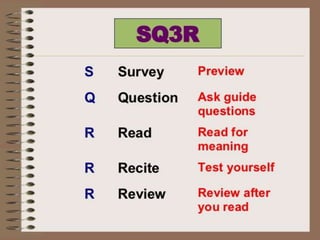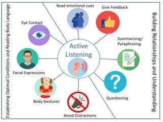 Study skills are important to develop life skills like critical thinking, decision making, and problem solving. Basic skills of communication include listening, reading, writing, and oral presentation. Listening involves receiving and constructing meaning from spoken messages. There are active listening techniques like paying attention and providing feedback. Note taking involves writing down key points from a lecture verbatim, while note making involves understanding and rephrasing the information in your own words. Proper citations and referencing are important to avoid plagiarism when writing essays or research papers.
