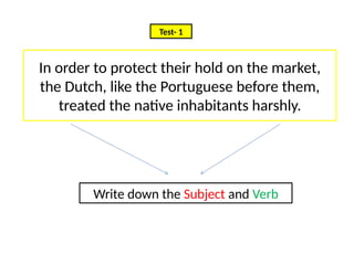 The document outlines a creative English course that includes basic language structures and verb usage, particularly focusing on subjects and verbs in sentences. It discusses the historical context of Dutch and Portuguese treatment of native populations while engaging with the cinnamon trade in Ceylon. Additionally, it provides grammar tests to reinforce understanding of sentence composition and verb forms.