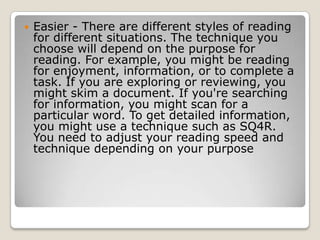 There are different reading techniques for different purposes. Skimming and scanning allow for quickly reviewing large amounts of information to find specific details. Skimming involves reading at an increased pace to identify main ideas, while scanning searches for particular words or phrases. Effective readers learn to apply the appropriate technique of skimming, scanning, or close reading based on whether they aim to get a general overview, locate specific information, or deeply understand details.