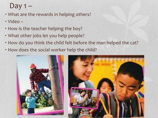1) Daily lessons that involve reading passages from the story, discussing vocabulary words, completing comprehension questions and activities, and practicing language conventions.