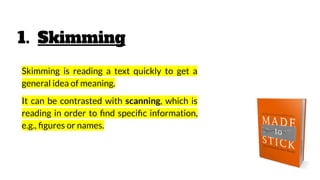 The document discusses four different reading styles: skimming, scanning, intensive reading, and extensive reading. Skimming involves reading quickly to get the general idea, while scanning means reading quickly to find specific information. Intensive reading means reading in detail for learning aims, whereas extensive reading is reading for enjoyment to develop general skills. Examples of each style and how they are used in the classroom are provided.