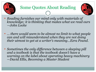 The document provides tips and strategies for effectively reading textbooks. It discusses setting up an environment conducive to focus, using different reading techniques like previewing, outlining, and questioning before, during, and after reading. The document also contrasts passive versus active reading, with suggestions for how to become a more active reader through techniques like annotating, highlighting, and engaging with the material in other ways. The overall message is that finding an individualized approach and remaining engaged are keys to getting the most out of reading assignments.