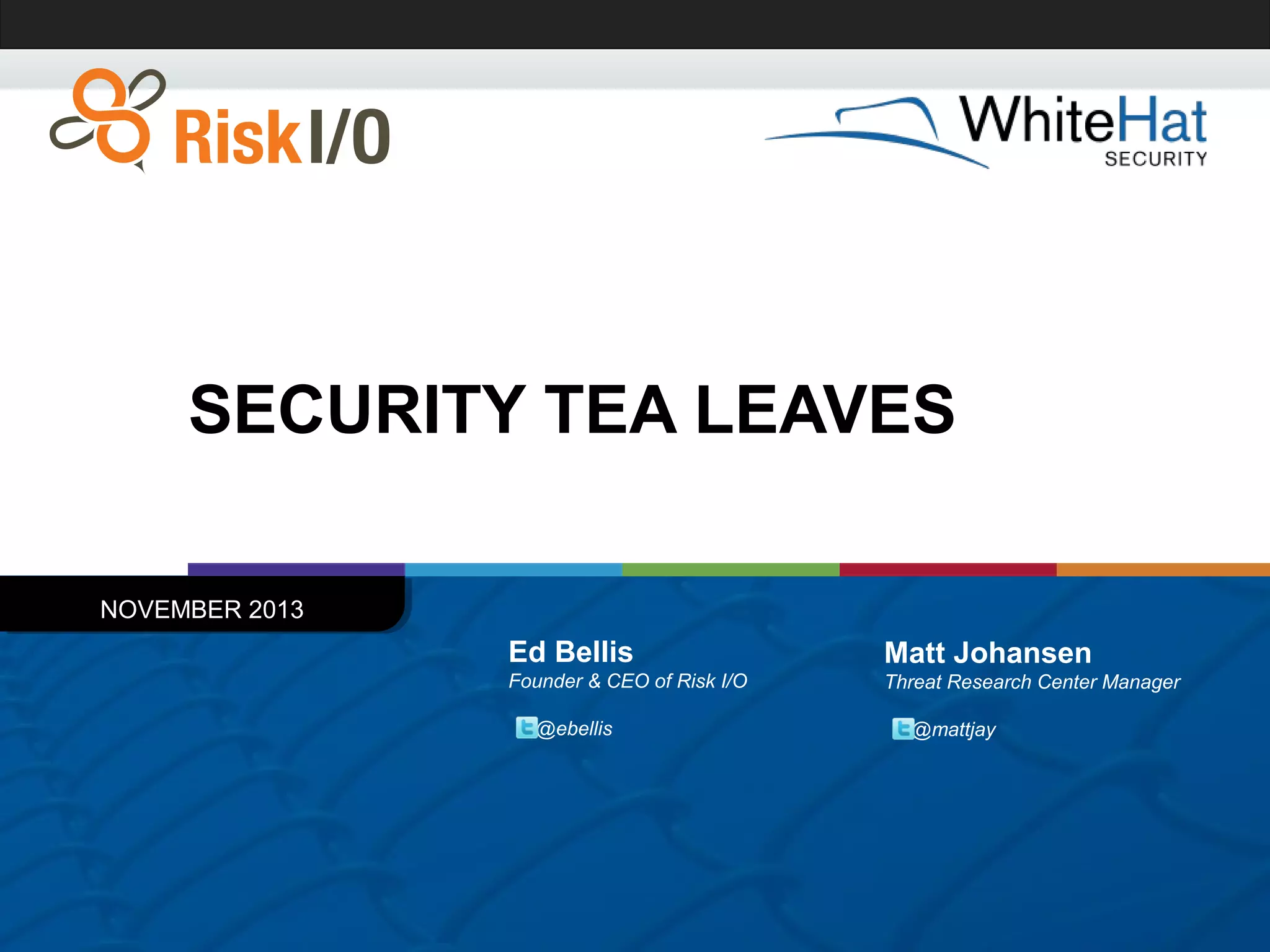 The document discusses the importance of vulnerability management in web security, highlighting the roles of Ed Bellis and Matt Johansen in the industry. It emphasizes the need for prioritizing vulnerability fixes based on compliance and effectiveness, and critiques the limitations of the OWASP Top 10 list. Additionally, it stresses the significance of real-time threat intelligence and the need for organizations to effectively manage and remediate vulnerabilities to prevent attacks.