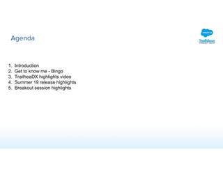 This document contains an agenda and materials for a TrailheaDX Global Gathering event. The agenda includes an introduction, icebreaker activity, highlights video, summer 2019 release overview, and breakout session highlights. The donation to FIRST and details about FIRST are provided. Instructions for a "get to know you" bingo activity are included. The presentation materials provide overviews and details about features from the Summer 2019 release like Salesforce Celebrations, Enhanced Related Lists, Notification Builder, and more. Breakout session highlights summarize topics from sessions on creating a Salesforce vision, demo best practices, organizing an org, and more. Attendees are encouraged to share about the event using specified hashtags.
